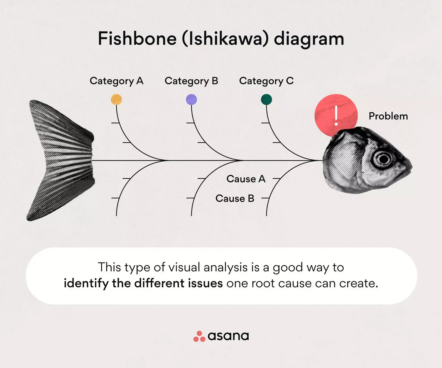Analyze Root CausesDive deep into understanding why these delays are happening. Are they due to insufficient resources, like understaffed teams or lack of necessary tools? Perhaps unclear responsibilities are causing confusion, or inefficient communication channels are leading to misunderstandings. Engaging with your team to get their perspectives can uncover hidden obstacles.The fishbone diagram (Ishikawa diagram) is a great analysis tool for problem solving. The head of the fish represents the issue or bottleneck you’re trying to solve. The ribs represent different categories and tasks.
